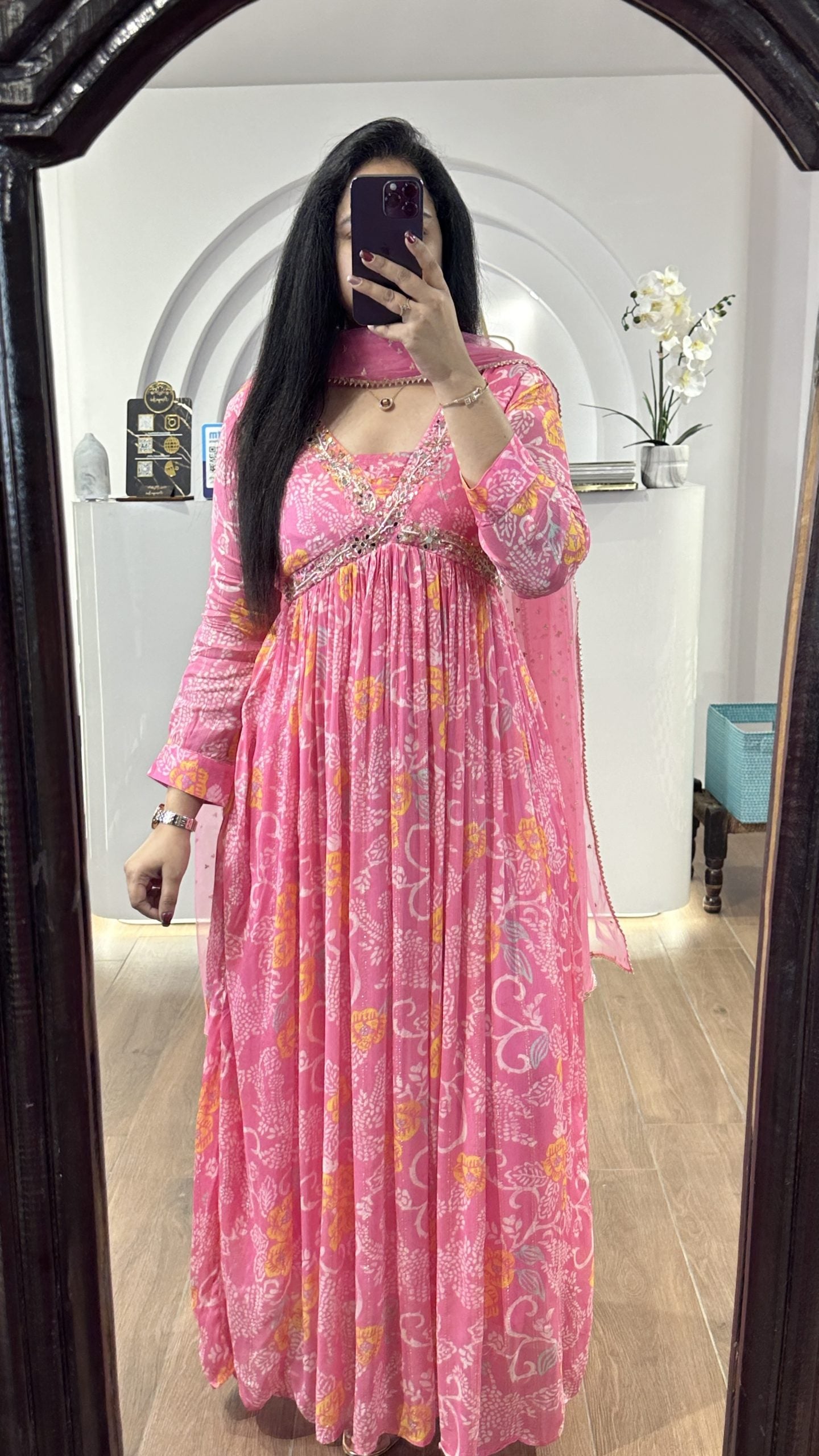 Baby Pink floral alia cut chinnon frock with embroidery